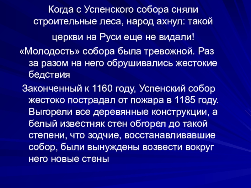 Законченный к 1160 году, Успенский собор жестоко пострадал от пожара в 1185 году. Выгорели все деревянные конструкции, а белый известняк стен обгорел до такой степени, что зодчие, восстанавливавшие собор, были вынуждены возвести вокруг него новые стены