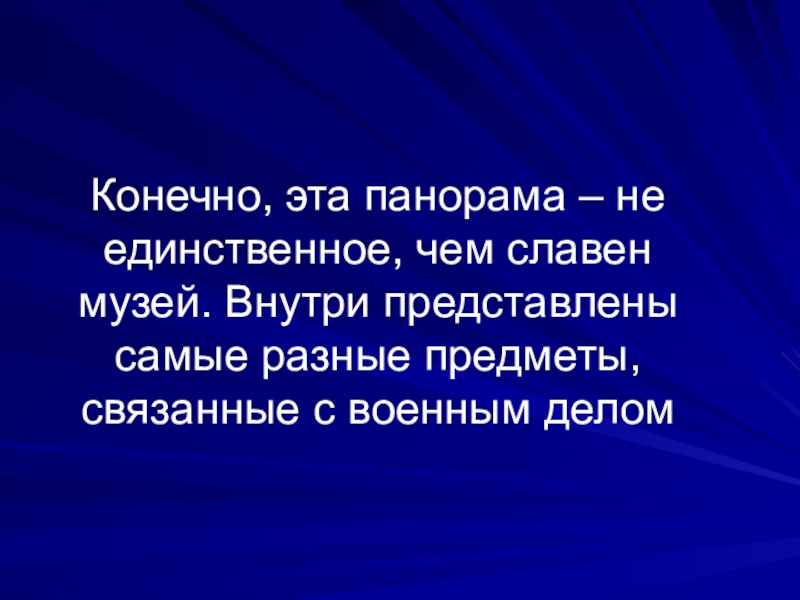 Слайд 33Конечно, эта панорама – не единственное, чем славен музей. Внутри представлены