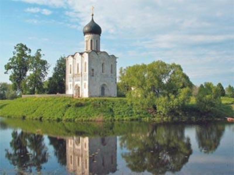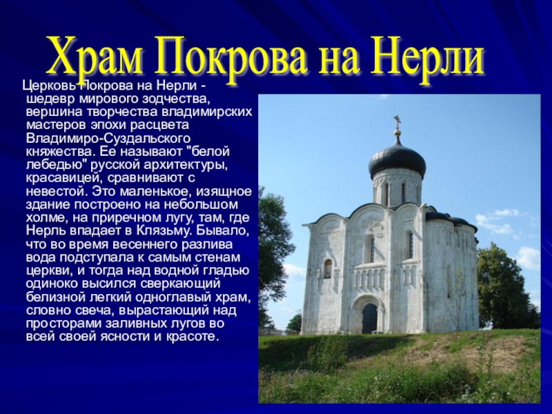 вершина творчества владимирских мастеров эпохи расцвета Владимиро-Суздальского княжества. Ее называют "белой лебедью" русской архитектуры, красавицей, сравнивают с невестой. Это маленькое, изящное здание построено на небольшом холме, на приречном лугу, там, где Нерль впадает в Клязьму. Бывало, что во время весеннего разлива вода подступала к самым стенам церкви, и тогда над водной гладью одиноко высился сверкающий белизной легкий одноглавый храм, словно свеча, вырастающий над просторами заливных лугов во всей своей ясности и красоте.