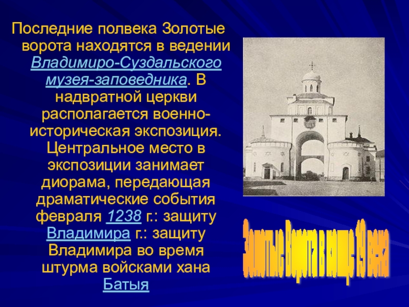 В надвратной церкви располагается военно-историческая экспозиция. Центральное место в экспозиции занимает диорама, передающая драматические события февраля 1238 г.: защиту Владимира г.: защиту Владимира во время штурма войсками хана Батыя