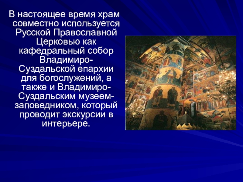 кафедральный собор Владимиро-Суздальской епархии для богослужений, а также и Владимиро-Суздальским музеем-заповедником, который проводит экскурсии в интерьере.