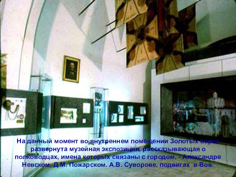 Слайд 34На данный момент во внутреннем помещении Золотых ворот развернута музейная экспозиция,