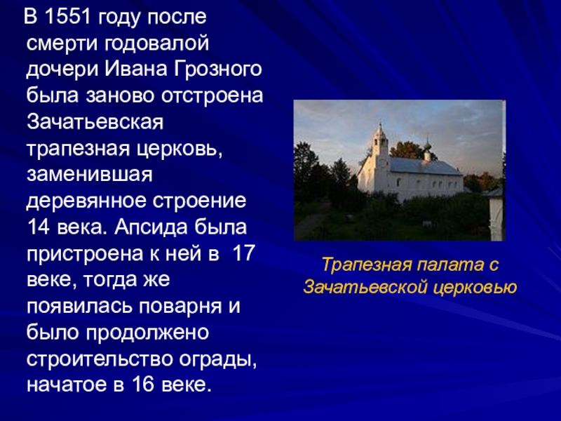 была заново отстроена Зачатьевская трапезная церковь, заменившая деревянное строение 14 века. Апсида была пристроена к ней в 17 веке, тогда же появилась поварня и было продолжено строительство ограды, начатое в 16 веке.
