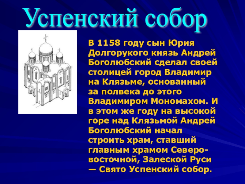 столицей город Владимир на Клязьме, основанный за полвека до этого Владимиром Мономахом. И в этом же году на высокой горе над Клязьмой Андрей Боголюбский начал строить храм, ставший главным храмом Северо-восточной, Залеской Руси — Свято Успенский собор.