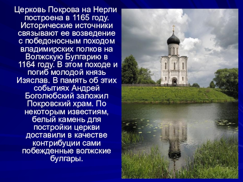Слайд 3 Церковь Покрова на Нерли построена в 1165 году. Исторические