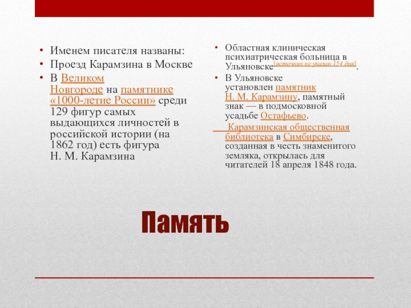 В Ульяновске установлен памятник Н. М. Карамзину, памятный знак — в подмосковной усадьбе Остафьево.