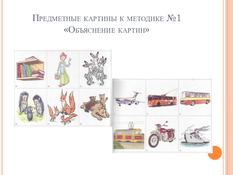 Слайд 8Предметные картины к методике №1 «Объяснение картин»
