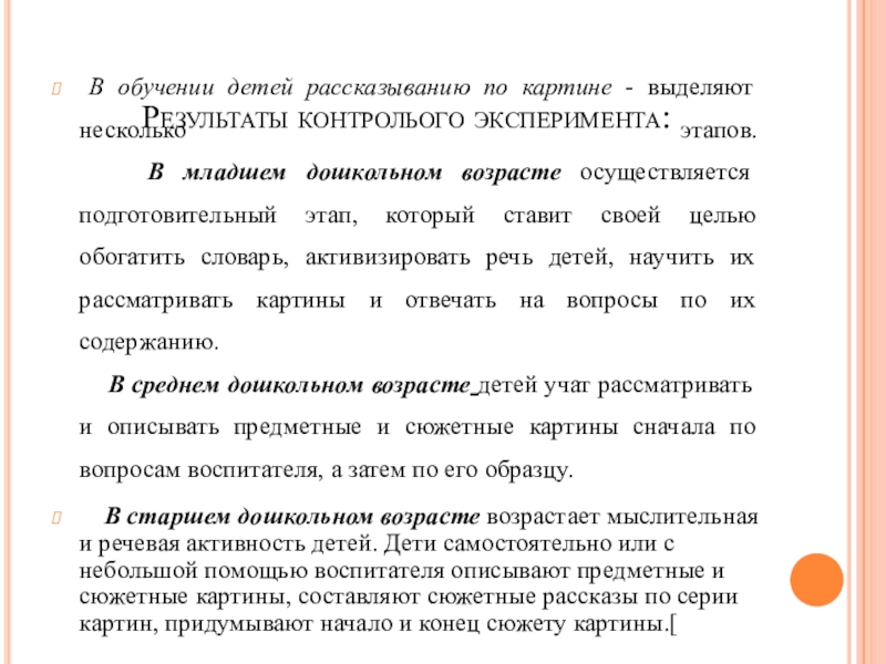 Результаты контролього эксперимента:  В обучении детей рассказыванию по картине - выделяют несколько этапов.