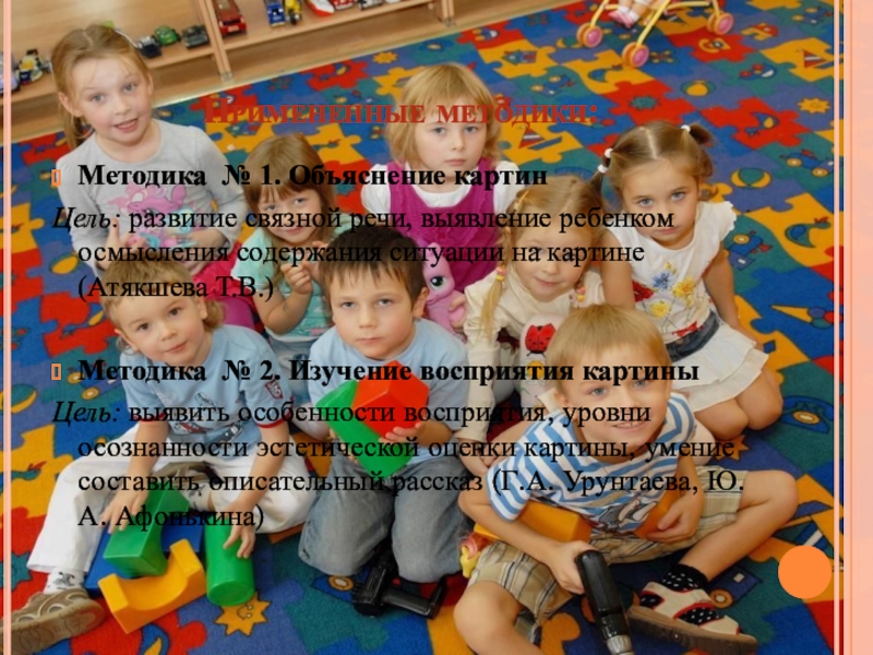Примененные методики:Методика № 1. Объяснение картинЦель: развитие связной речи, выявление ребенком осмысления содержания ситуации на картине (Атякшева