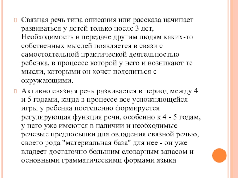 Активно связная речь развивается в период между 4 и 5 годами, когда в процессе все усложняющейся игры у ребенка постепенно формируется регулирующая функция речи, особенно к 4 - 5 годам, у него уже имеются в наличии и необходимые речевые предпосылки для овладения связной речью, своего рода "материальная база" для нее - он уже владеет достаточно большим словарным запасом и основными грамматическими формами языка