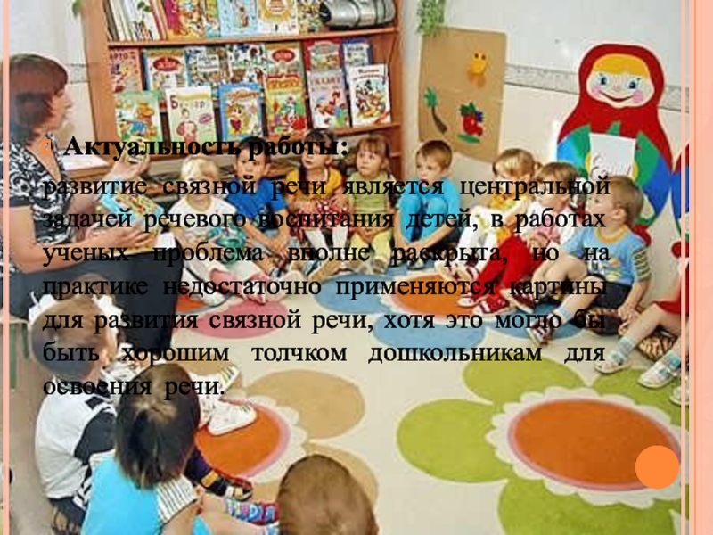 Актуальность работы: развитие связной речи является центральной задачей речевого воспитания детей, в работах ученых проблема вполне раскрыта, но на практике недостаточно применяются картины для развития связной речи, хотя это могло бы быть хорошим толчком дошкольникам для