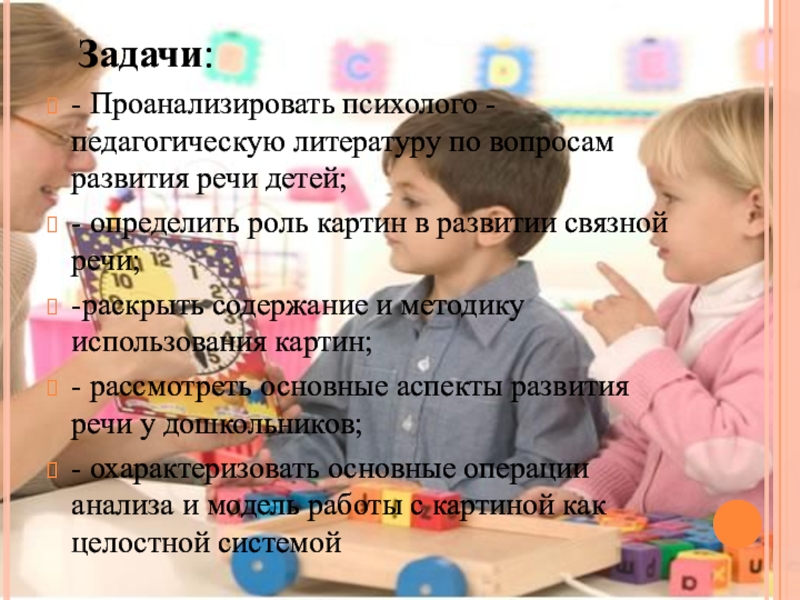 Задачи:- Проанализировать психолого - педагогическую литературу по вопросам развития речи детей;- определить роль картин в