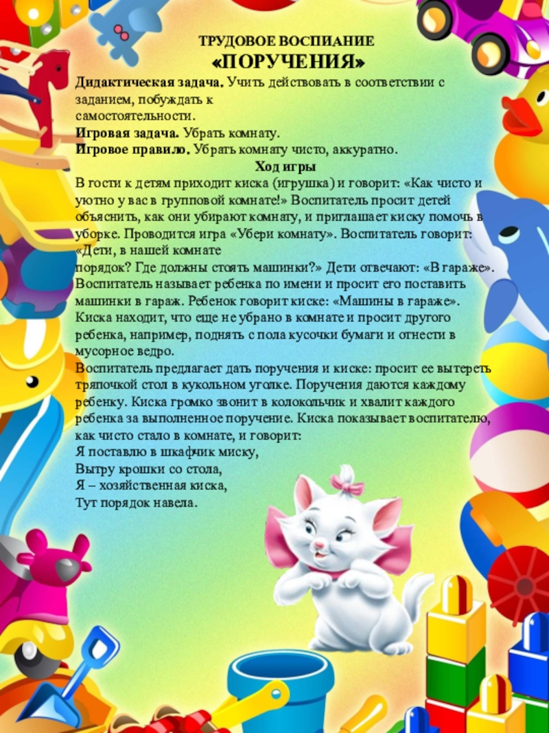 Воспитатель предлагает дать поручения и киске: просит ее вытереть тряпочкой стол в кукольном уголке. Поручения даются каждому ребенку. Киска громко звонит в колокольчик и хвалит каждого ребенка за выполненное поручение. Киска показывает воспитателю, как чисто стало в комнате, и говорит: