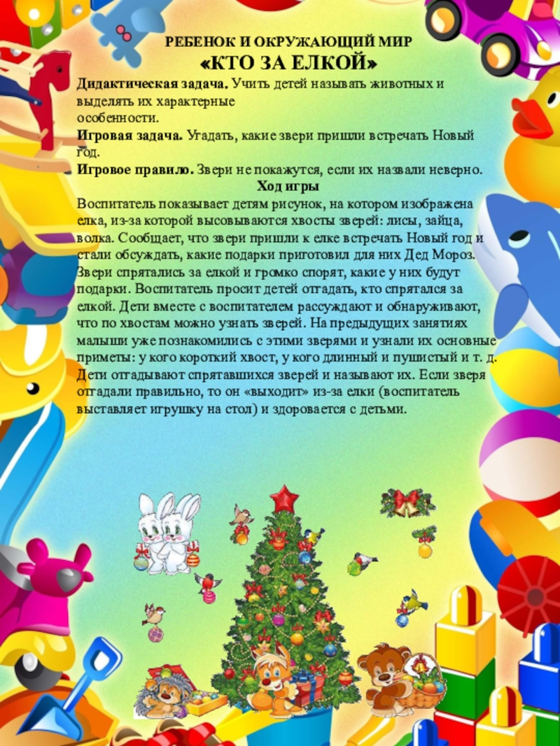 Воспитатель показывает детям рисунок, на котором изображена елка, из-за которой высовываются хвосты зверей: лисы, зайца, волка. Сообщает, что звери пришли к елке встречать Новый год и стали обсуждать, какие подарки приготовил для них Дед Мороз. Звери спрятались за елкой и громко спорят, какие у них будут подарки. Воспитатель просит детей отгадать, кто спрятался за елкой. Дети вместе с воспитателем рассуждают и обнаруживают, что по хвостам можно узнать зверей. На предыдущих занятиях малыши уже познакомились с этими зверями и узнали их основные приметы: у кого короткий хвост, у кого длинный и пушистый и т. д.