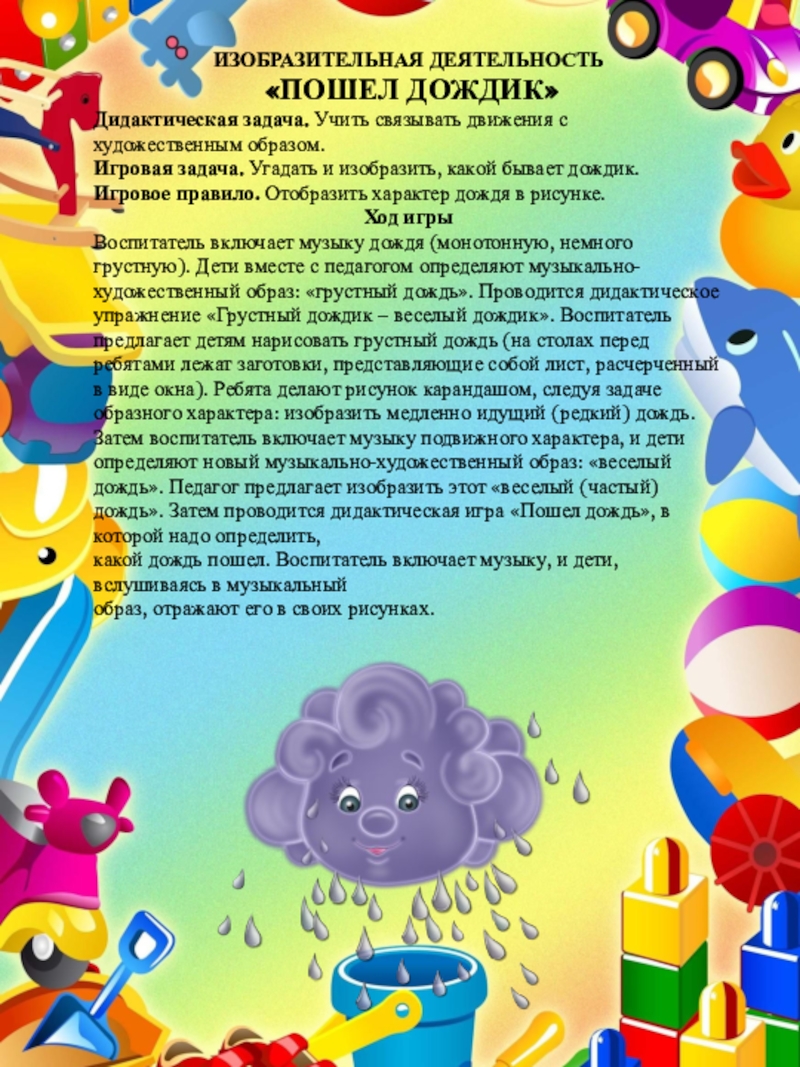 Воспитатель включает музыку дождя (монотонную, немного грустную). Дети вместе с педагогом определяют музыкально-художественный образ: «грустный дождь». Проводится дидактическое упражнение «Грустный дождик – веселый дождик». Воспитатель предлагает детям нарисовать грустный дождь (на столах перед ребятами лежат заготовки, представляющие собой лист, расчерченный в виде окна). Ребята делают рисунок карандашом, следуя задаче образного характера: изобразить медленно идущий (редкий) дождь. Затем воспитатель включает музыку подвижного характера, и дети определяют новый музыкально-художественный образ: «веселый дождь». Педагог предлагает изобразить этот «веселый (частый) дождь». Затем проводится дидактическая игра «Пошел дождь», в которой надо определить,