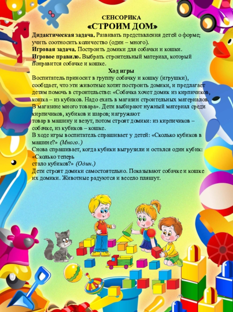 Воспитатель приносит в группу собачку и кошку (игрушки), сообщает, что эти животные хотят построить домики, и предлагает детям помочь в строительстве: «Собачка хочет домик из кирпичиков, кошка – из кубиков. Надо ехать в магазин строительных материалов. В магазине много товара». Дети выбирают нужный материал среди кирпичиков, кубиков и шаров; нагружают