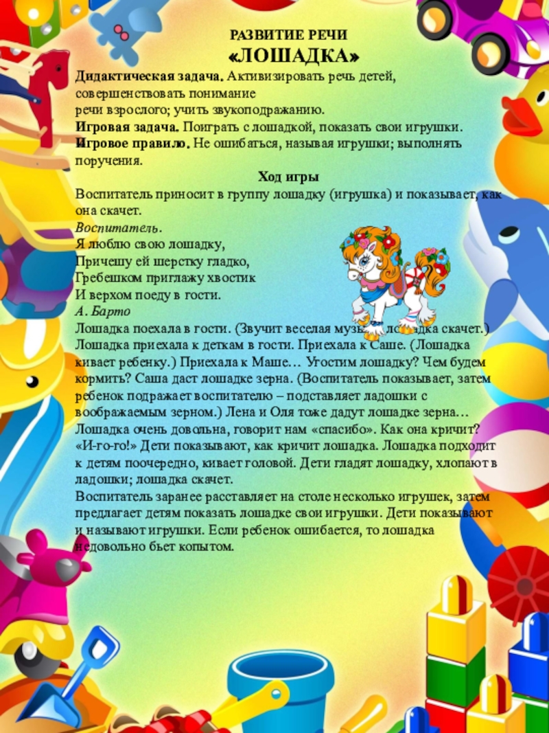 Воспитатель заранее расставляет на столе несколько игрушек, затем предлагает детям показать лошадке свои игрушки. Дети показывают и называют игрушки. Если ребенок ошибается, то лошадка недовольно бьет копытом.