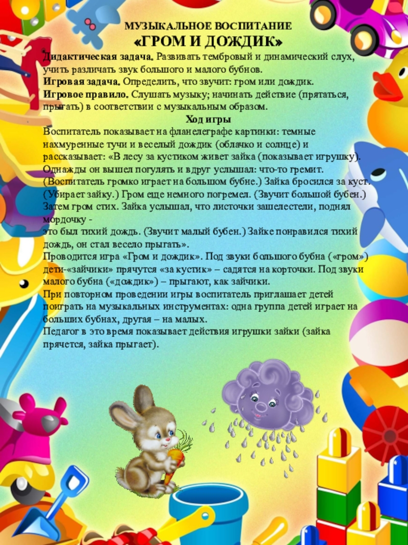 Воспитатель показывает на фланелеграфе картинки: темные нахмуренные тучи и веселый дождик (облачко и солнце) и рассказывает: «В лесу за кустиком живет зайка (показывает игрушку). Однажды он вышел погулять и вдруг услышал: что-то гремит. (Воспитатель громко играет на большом бубне.) Зайка бросился за куст. (Убирает зайку.) Гром еще немного погремел. (Звучит большой бубен.) Затем гром стих. Зайка услышал, что листочки зашелестели, поднял мордочку -
