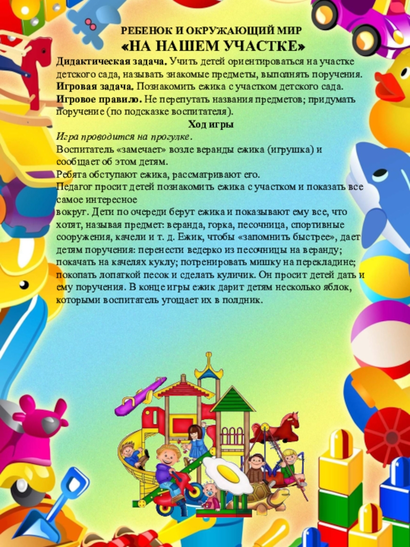 вокруг. Дети по очереди берут ежика и показывают ему все, что хотят, называя предмет: веранда, горка, песочница, спортивные сооружения, качели и т. д. Ежик, чтобы «запомнить быстрее», дает детям поручения: перенести ведерко из песочницы на веранду; покачать на качелях куклу; потренировать мишку на перекладине; покопать лопаткой песок и сделать куличик. Он просит детей дать и ему поручения. В конце игры ежик дарит детям несколько яблок, которыми воспитатель угощает их в полдник.