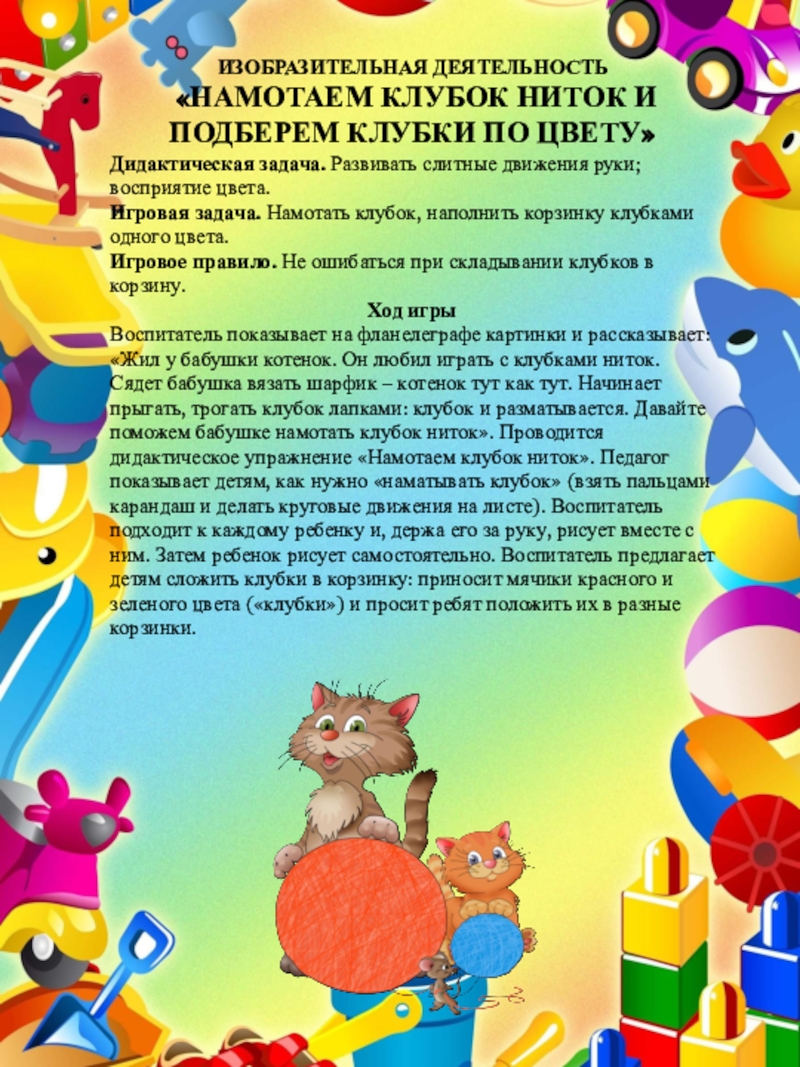 Воспитатель показывает на фланелеграфе картинки и рассказывает: «Жил у бабушки котенок. Он любил играть с клубками ниток. Сядет бабушка вязать шарфик – котенок тут как тут. Начинает прыгать, трогать клубок лапками: клубок и разматывается. Давайте поможем бабушке намотать клубок ниток». Проводится дидактическое упражнение «Намотаем клубок ниток». Педагог показывает детям, как нужно «наматывать клубок» (взять пальцами карандаш и делать круговые движения на листе). Воспитатель подходит к каждому ребенку и, держа его за руку, рисует вместе с ним. Затем ребенок рисует самостоятельно. Воспитатель предлагает детям сложить клубки в корзинку: приносит мячики красного и зеленого цвета («клубки») и просит ребят положить их в разные корзинки.