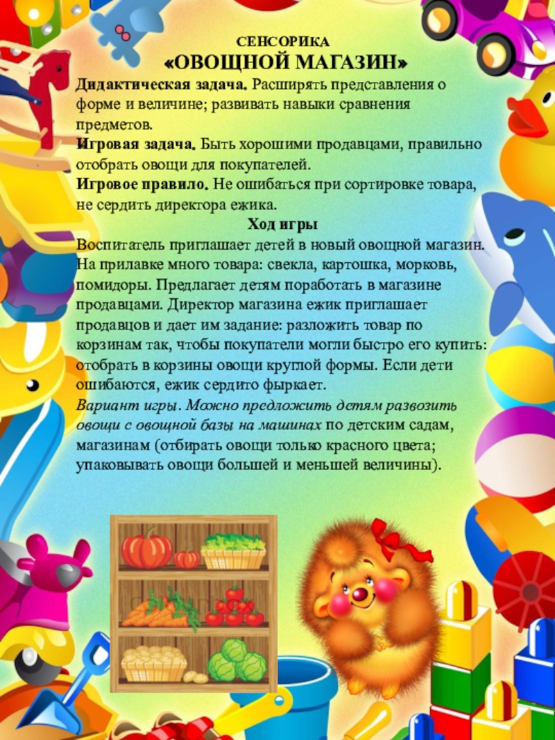 Воспитатель приглашает детей в новый овощной магазин. На прилавке много товара: свекла, картошка, морковь, помидоры. Предлагает детям поработать в магазине продавцами. Директор магазина ежик приглашает продавцов и дает им задание: разложить товар по корзинам так, чтобы покупатели могли быстро его купить: отобрать в корзины овощи круглой формы. Если дети ошибаются, ежик сердито фыркает.