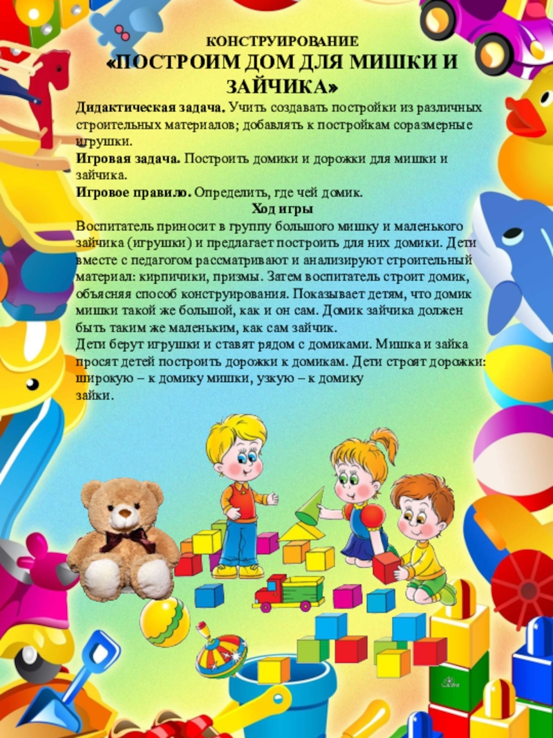 Воспитатель приносит в группу большого мишку и маленького зайчика (игрушки) и предлагает построить для них домики. Дети вместе с педагогом рассматривают и анализируют строительный материал: кирпичики, призмы. Затем воспитатель строит домик, объясняя способ конструирования. Показывает детям, что домик мишки такой же большой, как и он сам. Домик зайчика должен быть таким же маленьким, как сам зайчик.