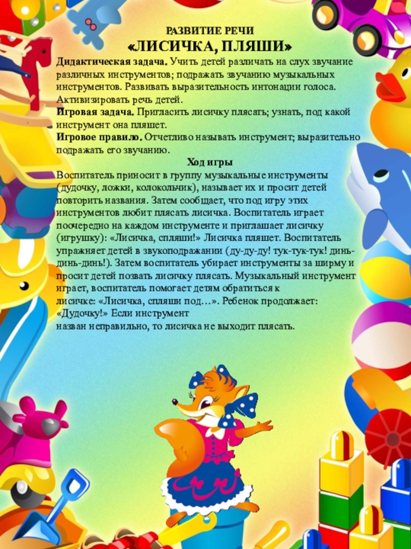 лисичке: «Лисичка, спляши под…». Ребенок продолжает: «Дудочку!» Если инструмент