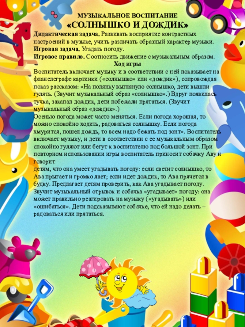 Воспитатель включает музыку и в соответствии с ней показывает на фланелеграфе картинки («солнышко» или «дождик»), сопровождая показ рассказом: «На полянку выглянуло солнышко, дети вышли гулять. (Звучит музыкальный образ «солнышко».) Вдруг появилась тучка, закапал дождик, дети побежали прятаться. (Звучит музыкальный образ «дождик».)