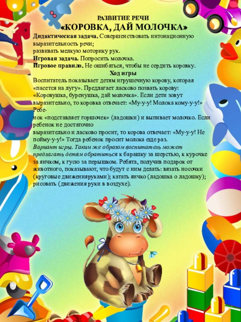 Воспитатель показывает детям игрушечную корову, которая «пасется на лугу». Предлагает ласково позвать корову: «Коровушка, буренушка, дай молочка». Если дети зовут выразительно, то коровка отвечает: «Му-у-у! Молока кому-у-у!» Ребе-