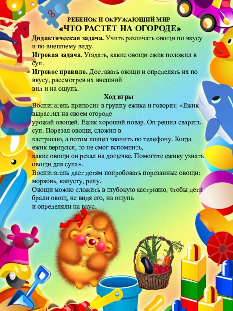 Игровое правило. Доставать овощи и определять их по вкусу, рассмотрев их внешний