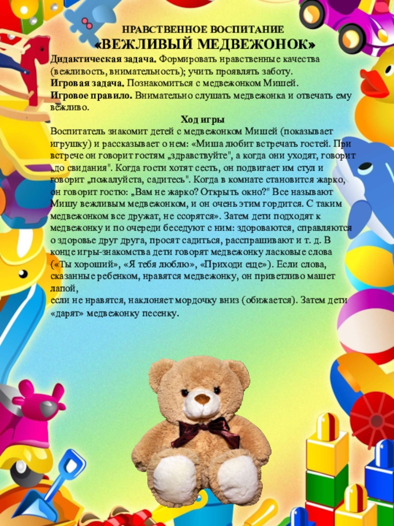 Воспитатель знакомит детей с медвежонком Мишей (показывает игрушку) и рассказывает о нем: «Миша любит встречать гостей. При встрече он говорит гостям „здравствуйте", а когда они уходят, говорит „до свидания". Когда гости хотят сесть, он подвигает им стул и говорит „пожалуйста, садитесь". Когда в комнате становится жарко, он говорит гостю: „Вам не жарко? Открыть окно?" Все называют Мишу вежливым медвежонком, и он очень этим гордится. С таким медвежонком все дружат, не ссорятся». Затем дети подходят к медвежонку и по очереди беседуют с ним: здороваются, справляются о здоровье друг друга, просят садиться, расспрашивают и т. д. В конце игры-знакомства дети говорят медвежонку ласковые слова («Ты хороший», «Я тебя люблю», «Приходи еще»). Если слова, сказанные ребенком, нравятся медвежонку, он приветливо машет лапой,