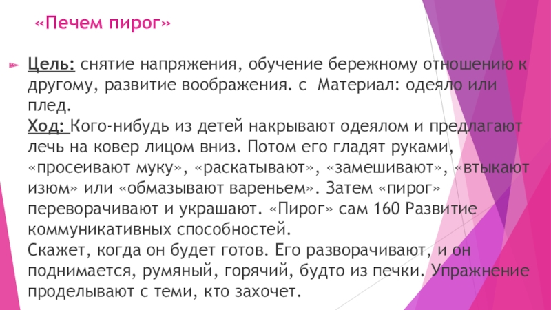 Ход: Кого-нибудь из детей накрывают одеялом и предлагают лечь на ковер лицом вниз. Потом его гладят руками, «просеивают муку», «раскатывают», «замешивают», «втыкают изюм» или «обмазывают вареньем». Затем «пирог» переворачивают и украшают. «Пирог» сам 160 Развитие коммуникативных способностей.