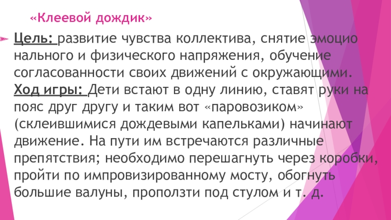 Ход игры: Дети встают в одну линию, ставят руки на пояс друг другу и таким вот «паровозиком» (склеившимися дождевыми капельками) начинают движение. На пути им встречаются различные препятствия; необходимо перешагнуть через коробки, пройти по импровизированному мосту, обогнуть большие валуны, проползти под стулом и т. д.