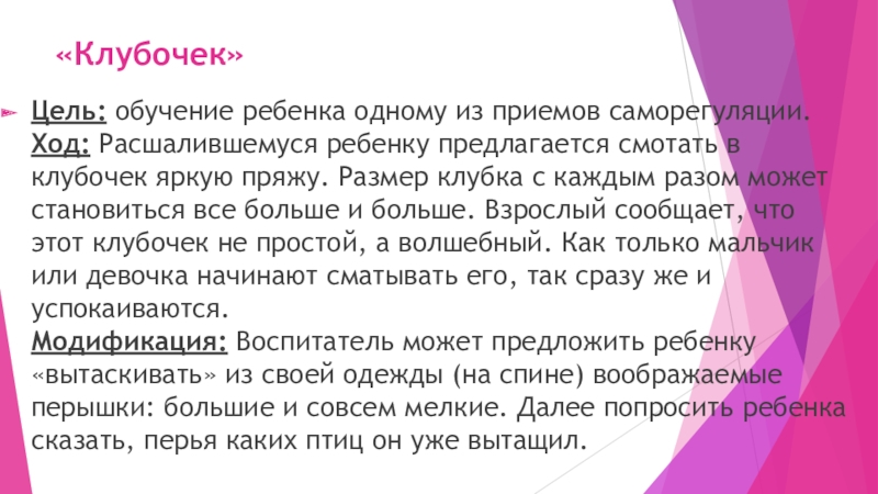 в клубочек яркую пряжу. Размер клубка с каждым разом может становиться все больше и больше. Взрослый сообщает, что этот клубочек не простой, а волшебный. Как только мальчик или девочка начинают сматывать его, так сразу же и успокаиваются.