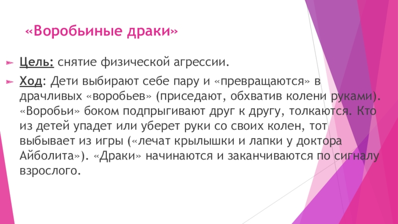 в драчливых «воробьев» (приседают, обхватив колени руками). «Воробьи» боком подпрыгивают друг к другу, толкаются. Кто из детей упадет или уберет руки со своих колен, тот выбывает из игры («лечат крылышки и лапки у доктора Айболита»). «Драки» начинаются и заканчиваются по сигналу взрослого.