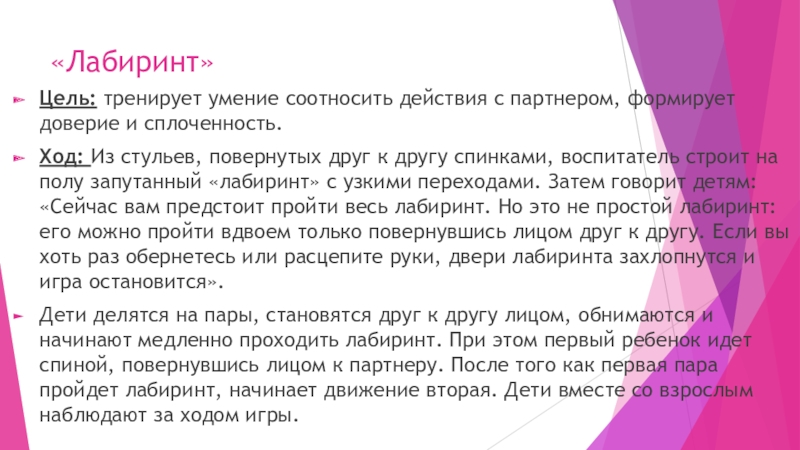 Ход: Из стульев, повернутых друг к другу спинками, воспитатель строит на полу запутанный «лабиринт» с узкими переходами. Затем говорит детям: «Сейчас вам предстоит пройти весь лабиринт. Но это не простой лабиринт: его можно пройти вдвоем только повернувшись лицом друг к другу. Если вы хоть раз обернетесь или расцепите руки, двери лабиринта захлопнутся и игра остановится».