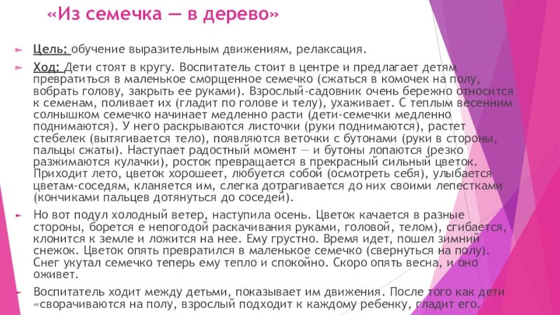 в кругу. Воспитатель стоит в центре и предлагает детям превратиться в маленькое сморщенное семечко (сжаться в комочек на полу, вобрать голову, закрыть ее руками). Взрослый-садовник очень бережно относится к семенам, поливает их (гладит по голове и телу), ухаживает. С теплым весенним солнышком семечко начинает медленно расти (дети-семечки медленно поднимаются). У него раскрываются листочки (руки поднимаются), растет стебелек (вытягивается тело), появляются веточки с бутонами (руки в стороны, пальцы сжаты). Наступает радостный момент — и бутоны лопаются (резко разжимаются кулачки), росток превращается в прекрасный сильный цветок. Приходит лето, цветок хорошеет, любуется собой (осмотреть себя), улыбается цветам-соседям, кланяется им, слегка дотрагивается до них своими лепестками (кончиками пальцев дотянуться до соседей).