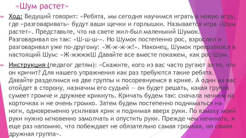 игру, где «разговаривать» будут ваши щечки и горлышки. Называется игра «Шум растет». Представьте, что на свете жил-был маленький Шумок. Разговаривал он так: «Ш-ш-ш-». Но Шумок постепенно рос, взрослел и разговаривал уже по-другому: «Ж-ж-ж-ж!». Наконец, Шумок превратился в настоящий Шум: «Ж-жжжжШ Давайте все вместе покажем, как рос Шум.
