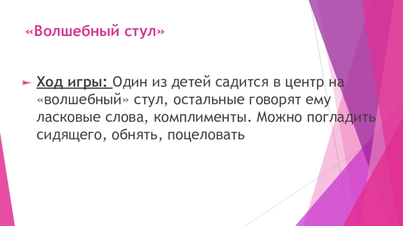 стул, остальные говорят ему ласковые слова, комплименты. Можно погладить сидящего, обнять, поцеловать