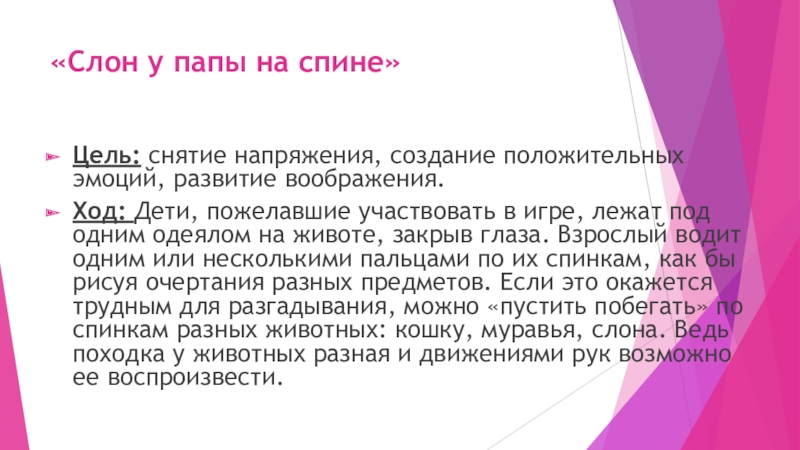 Ход: Дети, пожелавшие участвовать в игре, лежат под одним одеялом на животе, закрыв глаза. Взрослый водит одним или несколькими пальцами по их спинкам, как бы рисуя очертания разных предметов. Если это окажется трудным для разгадывания, можно «пустить побегать» по спинкам разных животных: кошку, муравья, слона. Ведь походка у животных разная и движениями рук возможно ее воспроизвести.