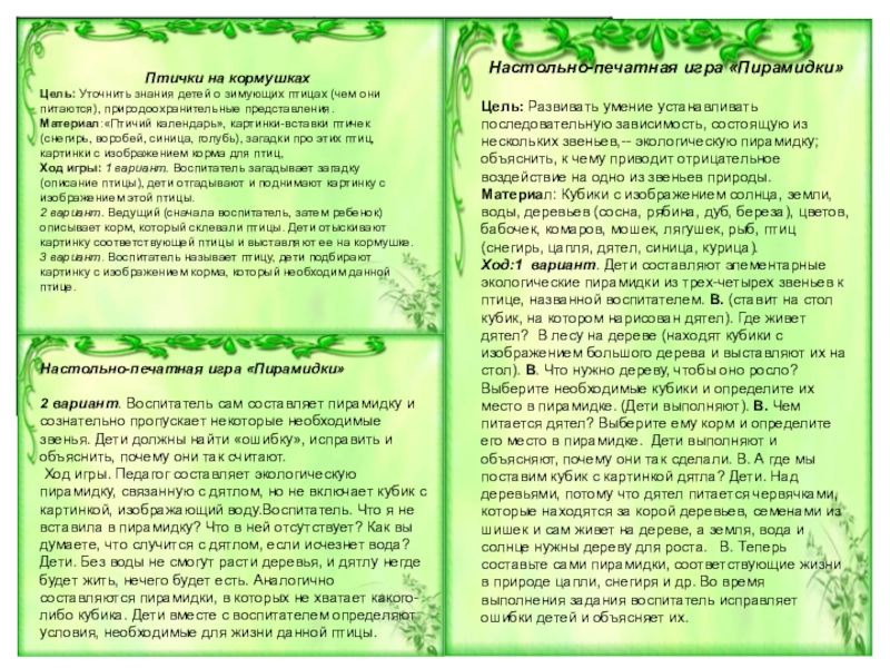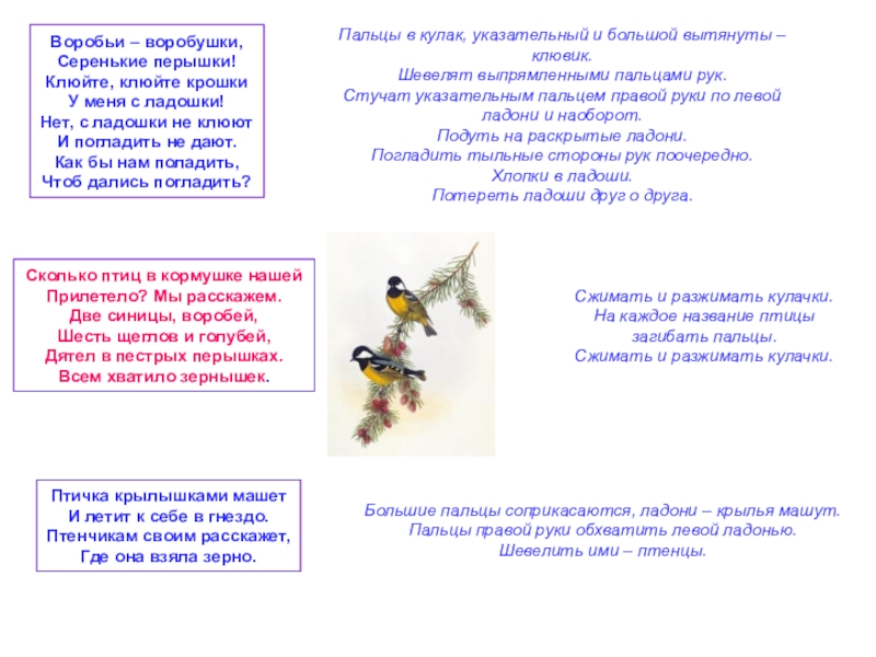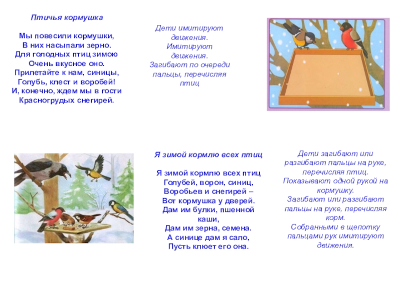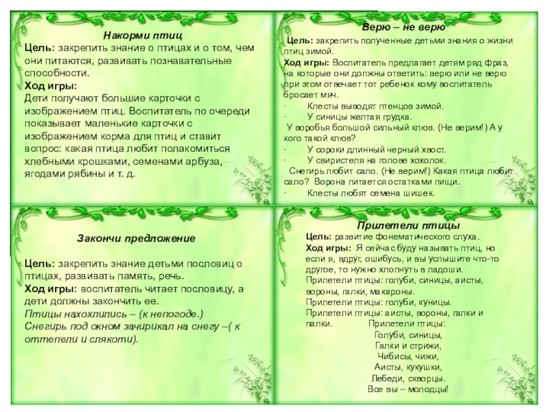 Цель: воспитывать доброе, бережное отношение к пернатым друзьям.