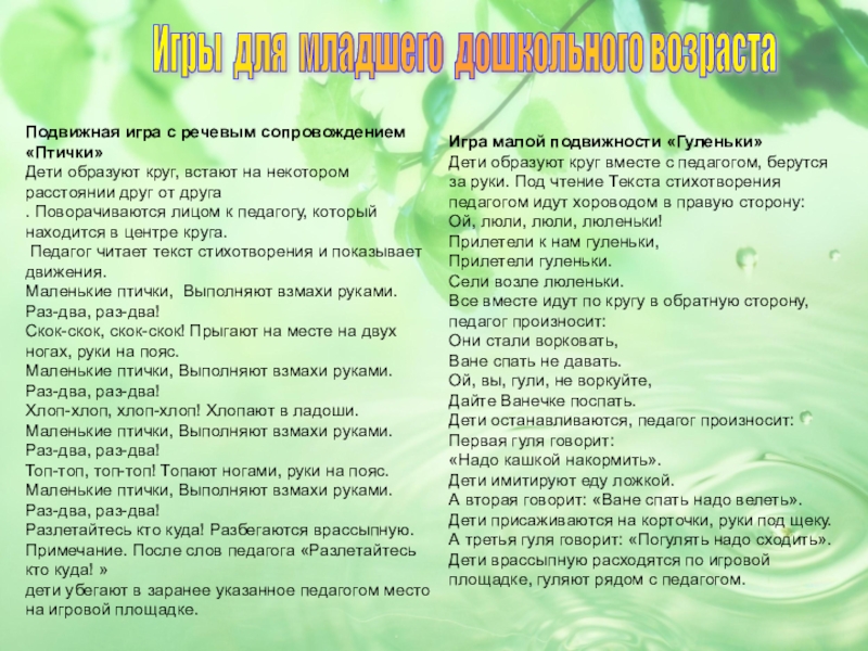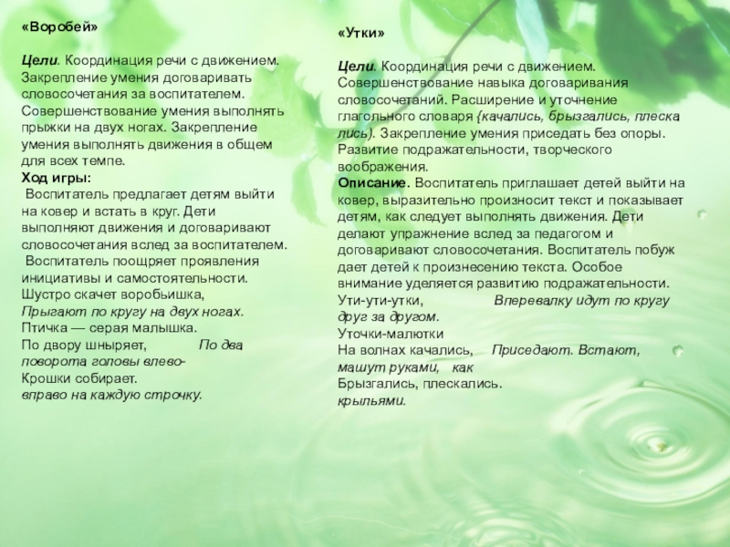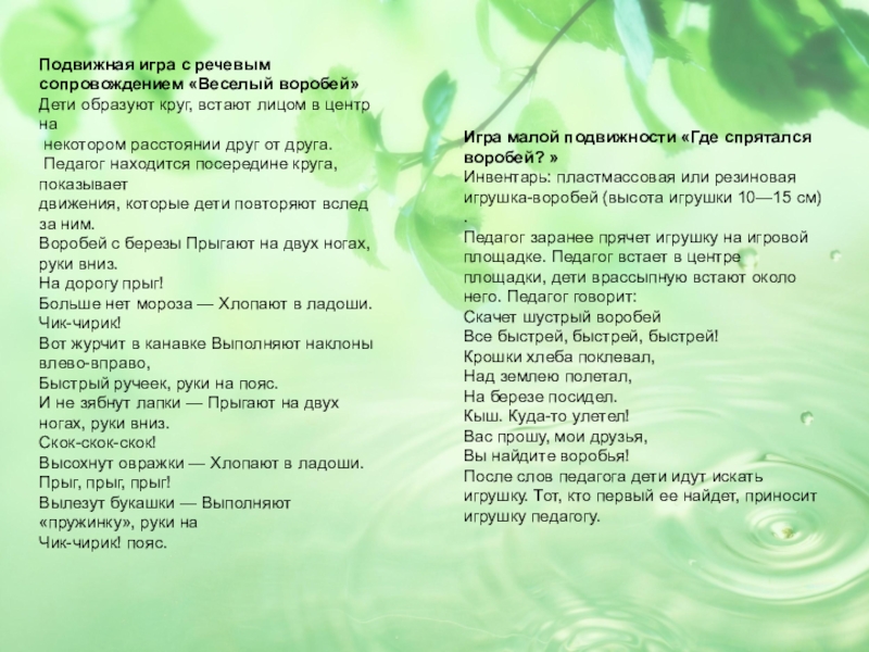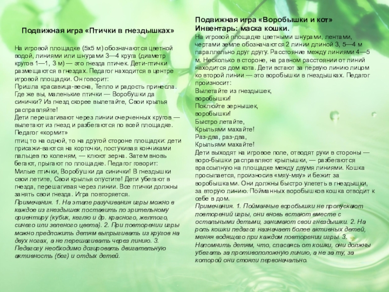 Воспитатель. Воробей. (Бросает мяч ребенку.) 2-й ребенок. Летит. (Бросает мяч воспитателю.)