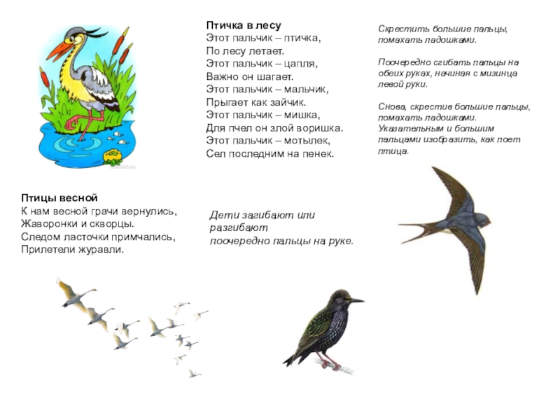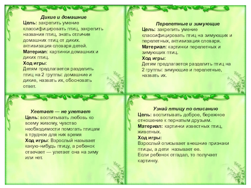 Ход игры: Взрослый называет какую-нибудь птицу, а ребенок отвечает — улетает она на зиму или нет.