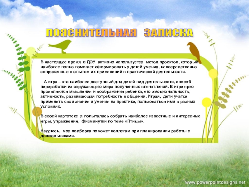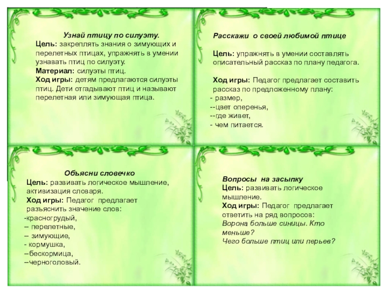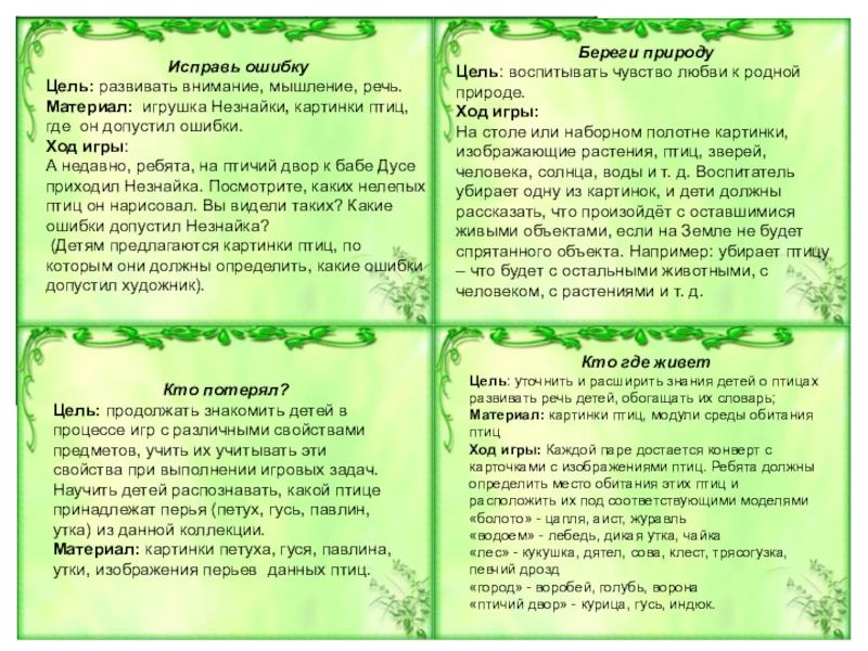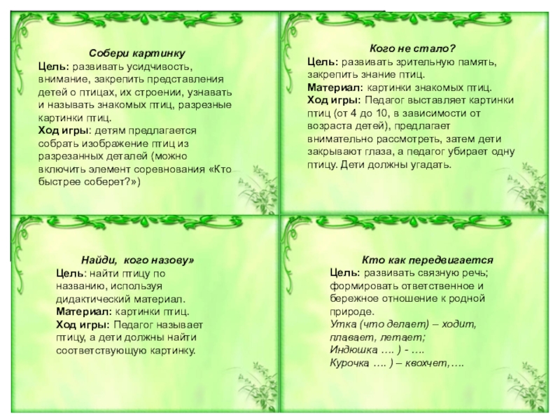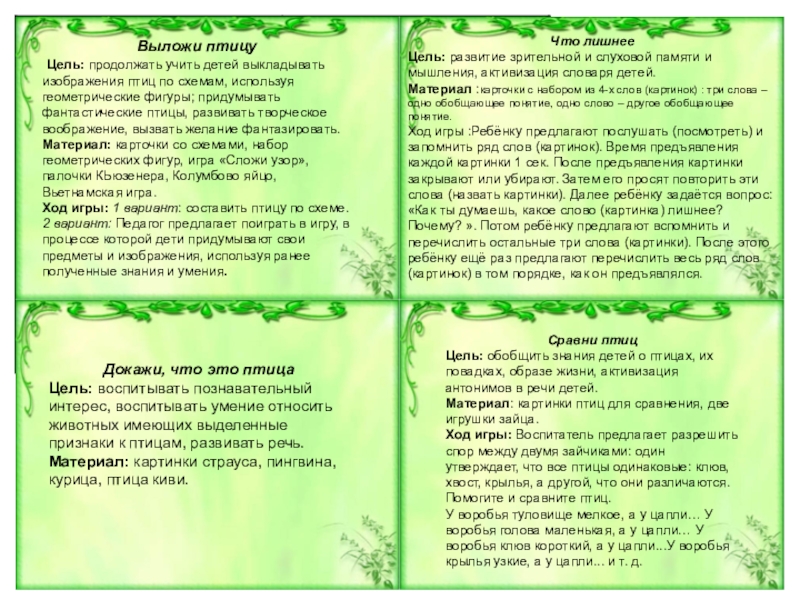 Цель: учить детей узнавать и называть птиц; развивать зрительную память учить детей узнавать и называть птиц; развивать зрительную память, мышление; воспитывать любовь к природе.