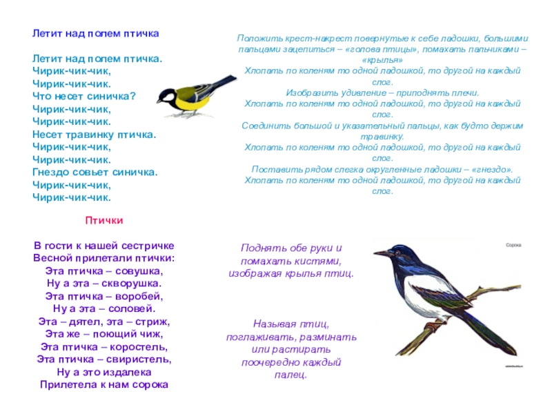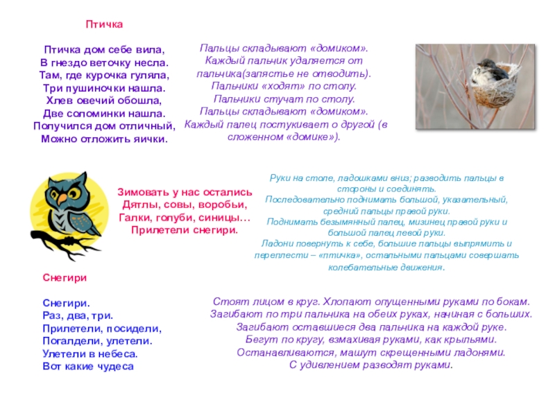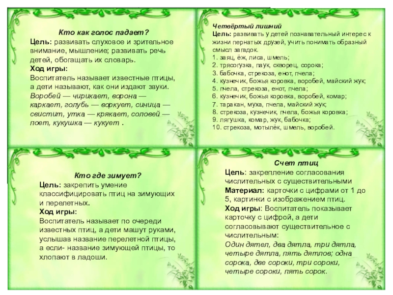 Воспитатель называет известные птицы, а дети называют, как они издают звуки.