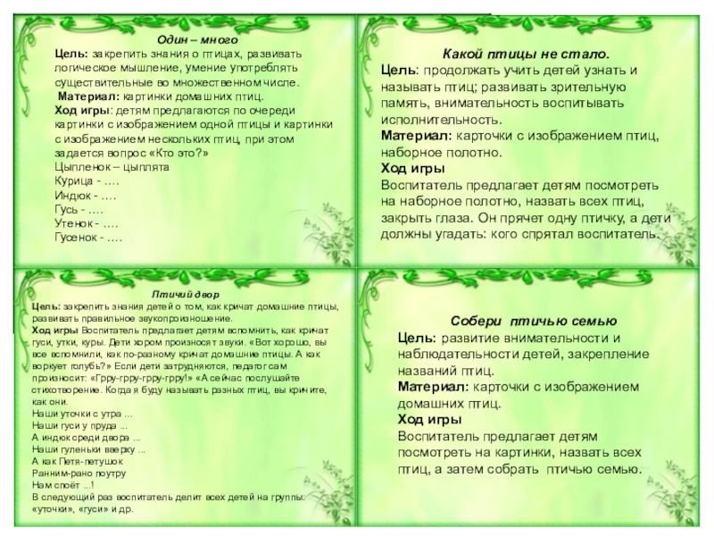 Цель: закрепить знания детей о том, как кричат домашние птицы, развивать правильное звукопроизношение.