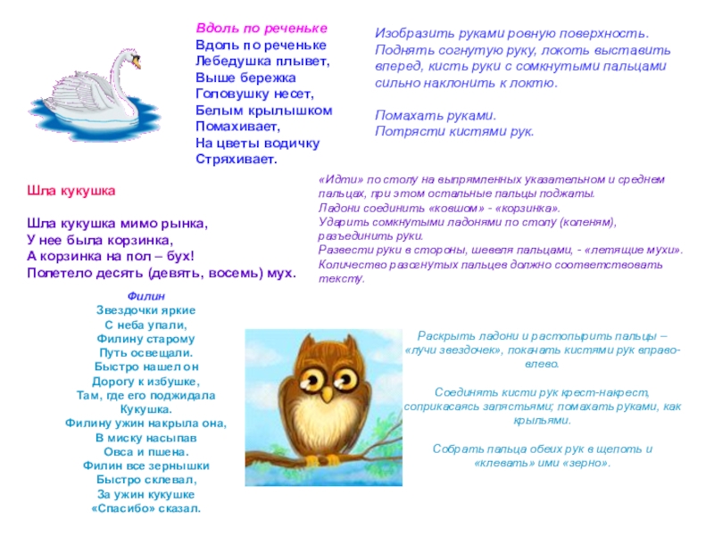 Описание. Воспитатель приглашает детей выйти на ковер, выразительно произносит текст и показывает детям, как следует выполнять движения. Дети делают упражнение вслед за педагогом и договаривают словосочетания. Воспитатель побуждает детей к произнесению текста. Особое внимание уделяется развитию подражательности.