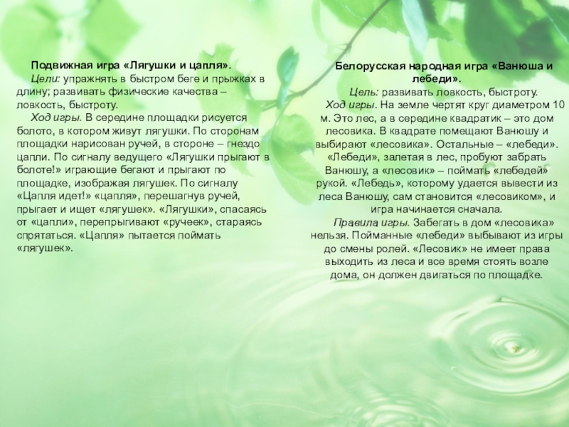 Ход игры. На земле чертят круг диаметром 10 м. Это лес, а в середине квадратик – это дом лесовика. В квадрате помещают Ванюшу и выбирают «лесовика». Остальные – «лебеди». «Лебеди», залетая в лес, пробуют забрать Ванюшу, а «лесовик» – поймать «лебедей» рукой. «Лебедь», которому удается вывести из леса Ванюшу, сам становится «лесовиком», и игра начинается сначала.
