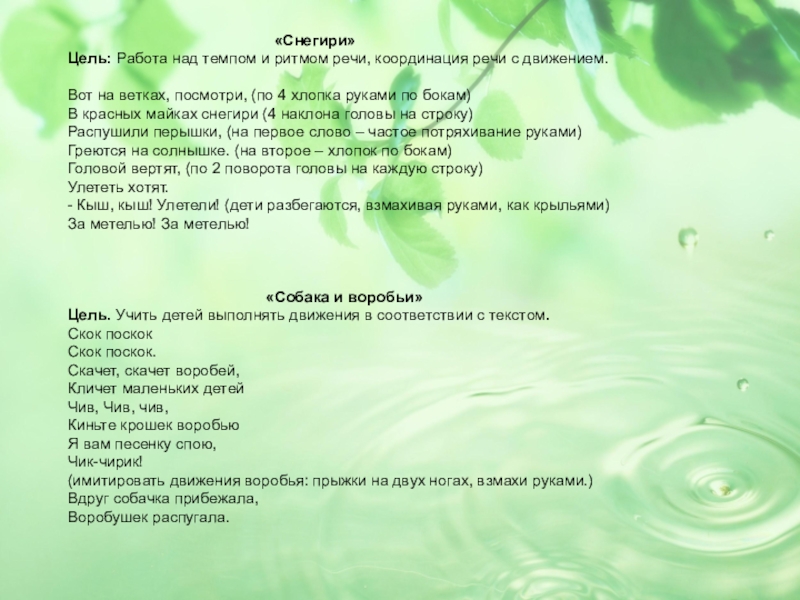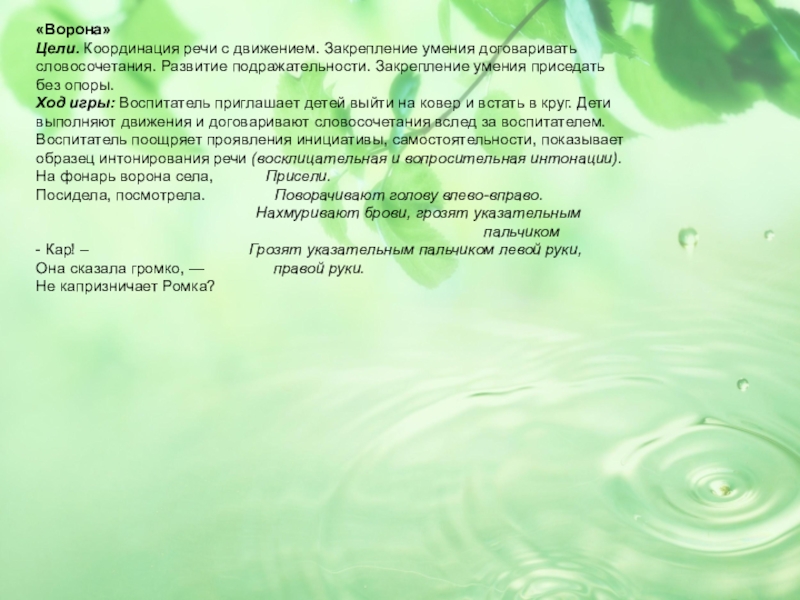 Цели. Координация речи с движением. Совершенствование навыка договаривания словосочетаний. Расширение и уточнение глагольного словаря {качались, брызгались, плескались). Закрепление умения приседать без опоры. Развитие подражательности, творческого воображения.