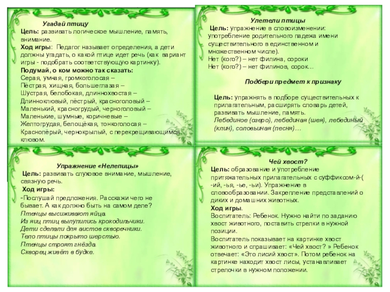 Ход игры: Педагог выставляет картинки птиц (от 4 до 10, в зависимости от возраста детей), предлагает внимательно рассмотреть, затем дети закрывают глаза, а педагог убирает одну птицу. Дети должны угадать.